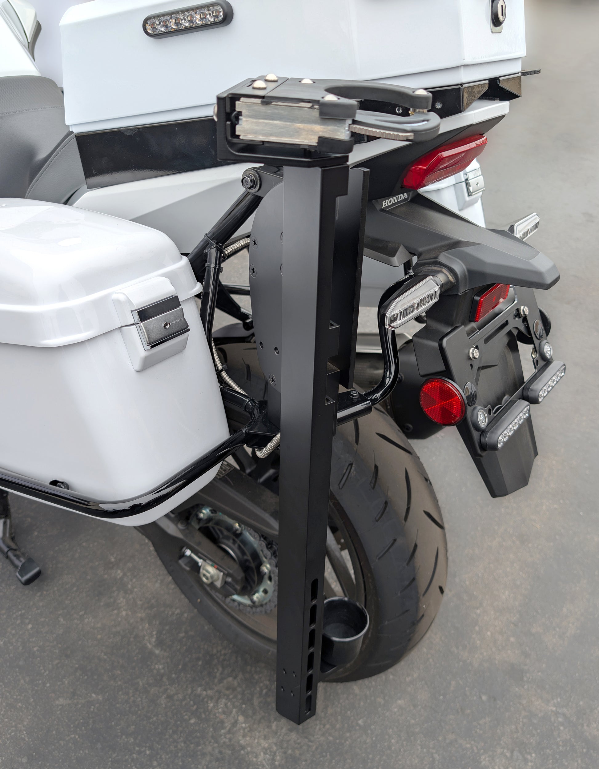This aluminum rifle rack is made to fit the NT1100 police motorcycle and can be adjusted to match the length of your rifle. You can add optional muzzle cups if you're using a suppressor. It has a built-in electric lock with a backup key for extra security. Strong but lightweight, it keeps your rifle safe and secure while you're on the move.