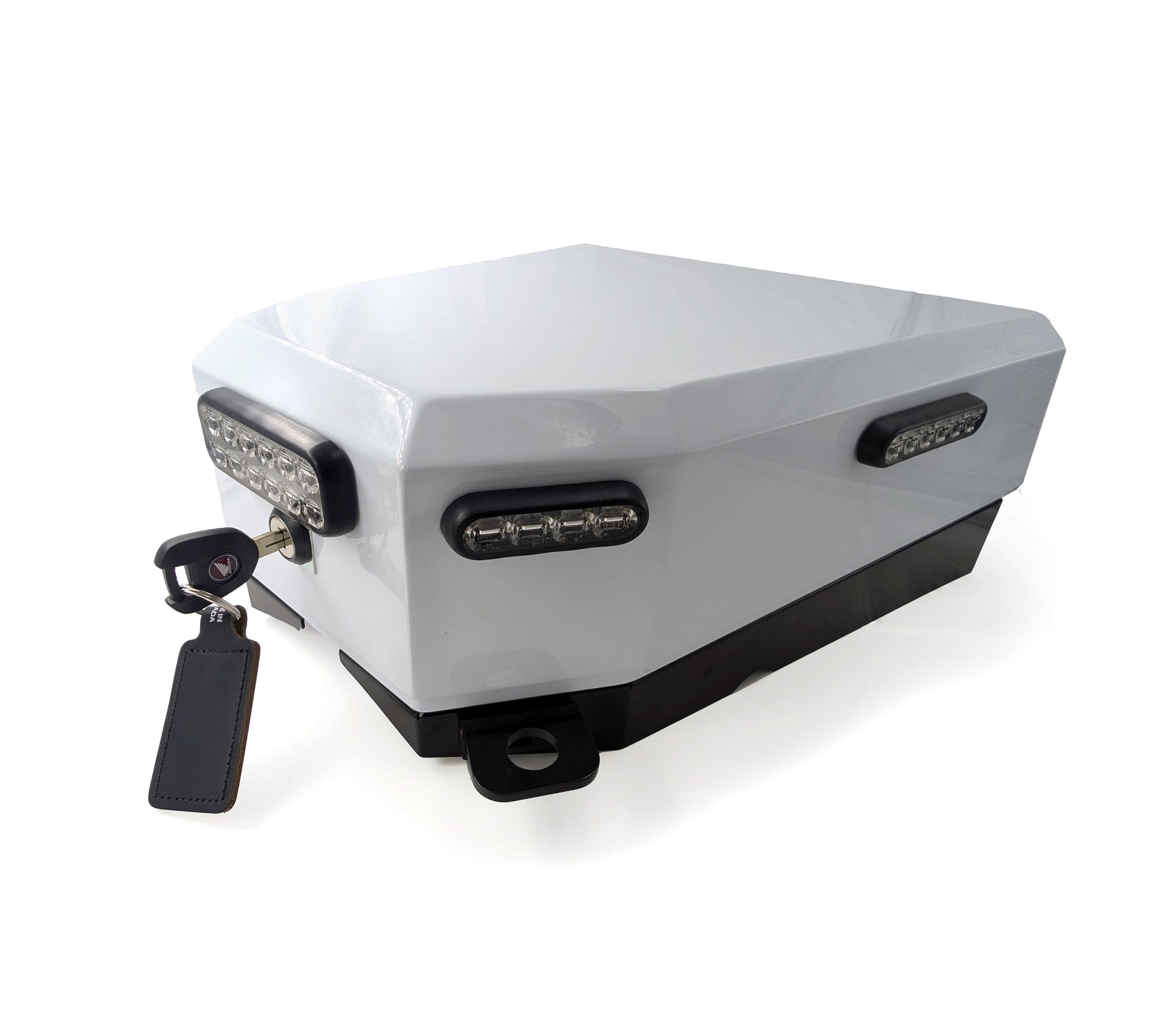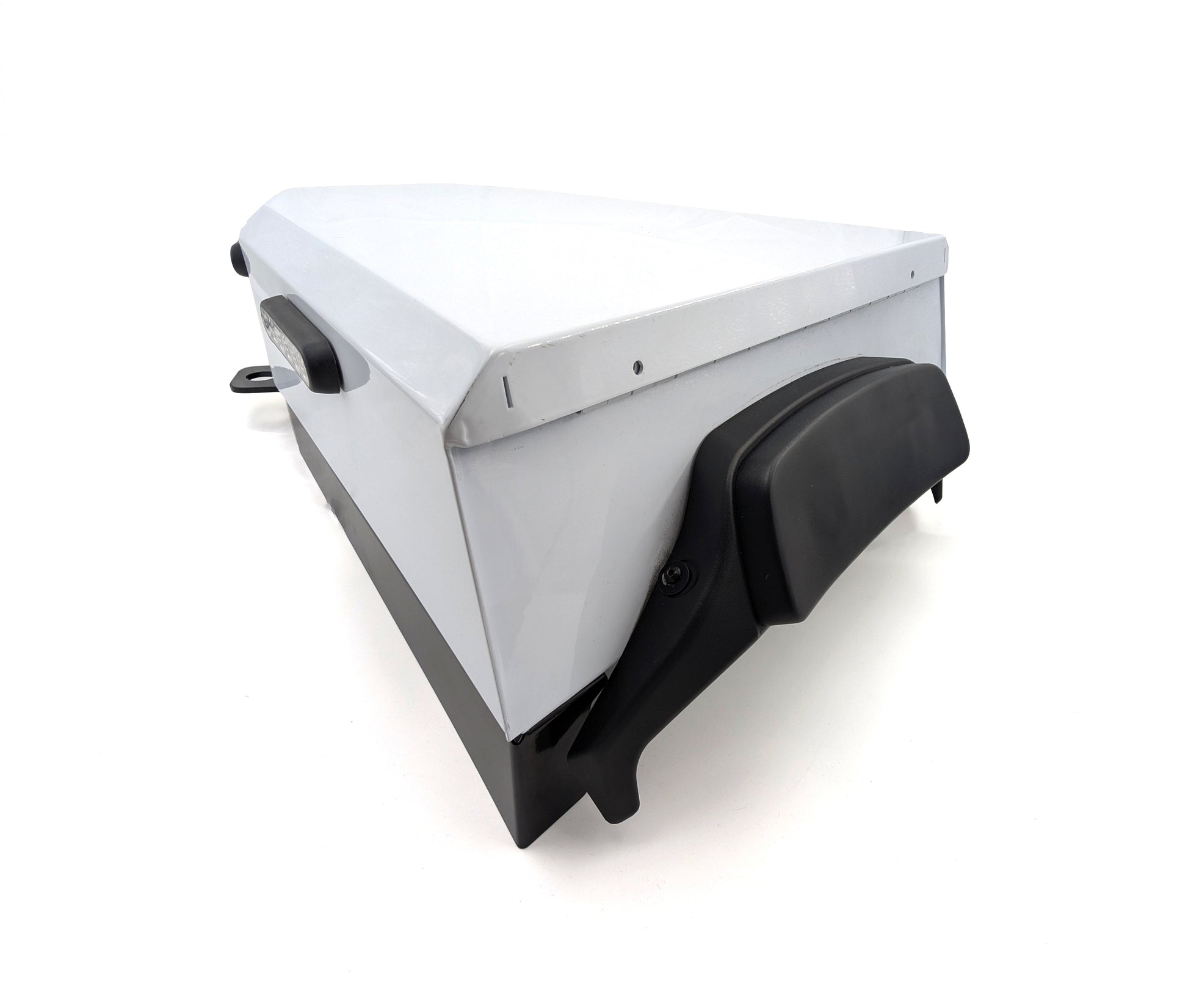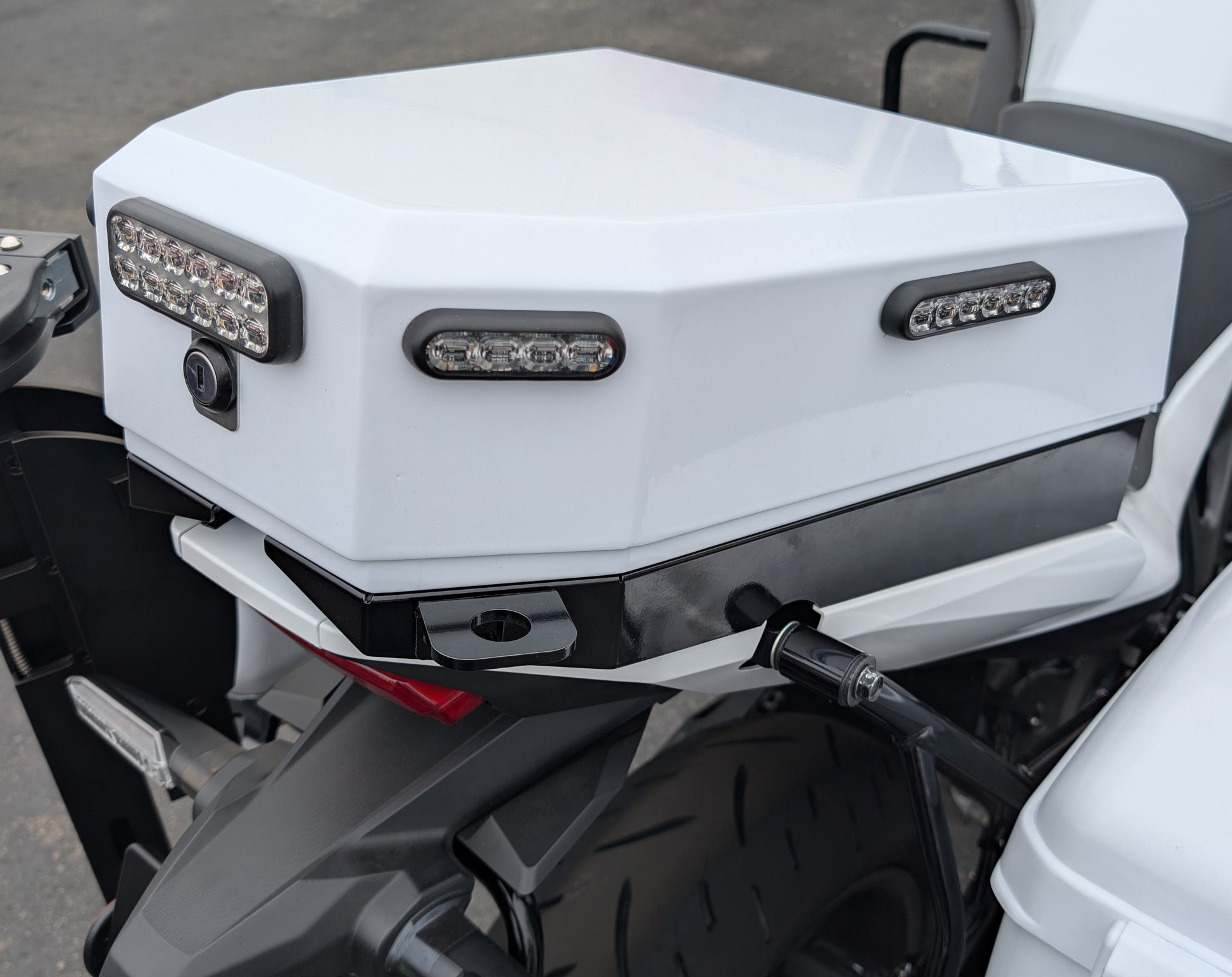 This custom-made radio box, built from durable steel and aluminum, provides reliable protection for your police radios. It fits two radios with an antenna mount and features a lock keyed specifically to your motorcycle for secure storage. Lights shown on the box are sold separately. Beyond protecting your communication devices, this sturdy box can also be used for additional storage, keeping your equipment safe and easily accessible during duty.